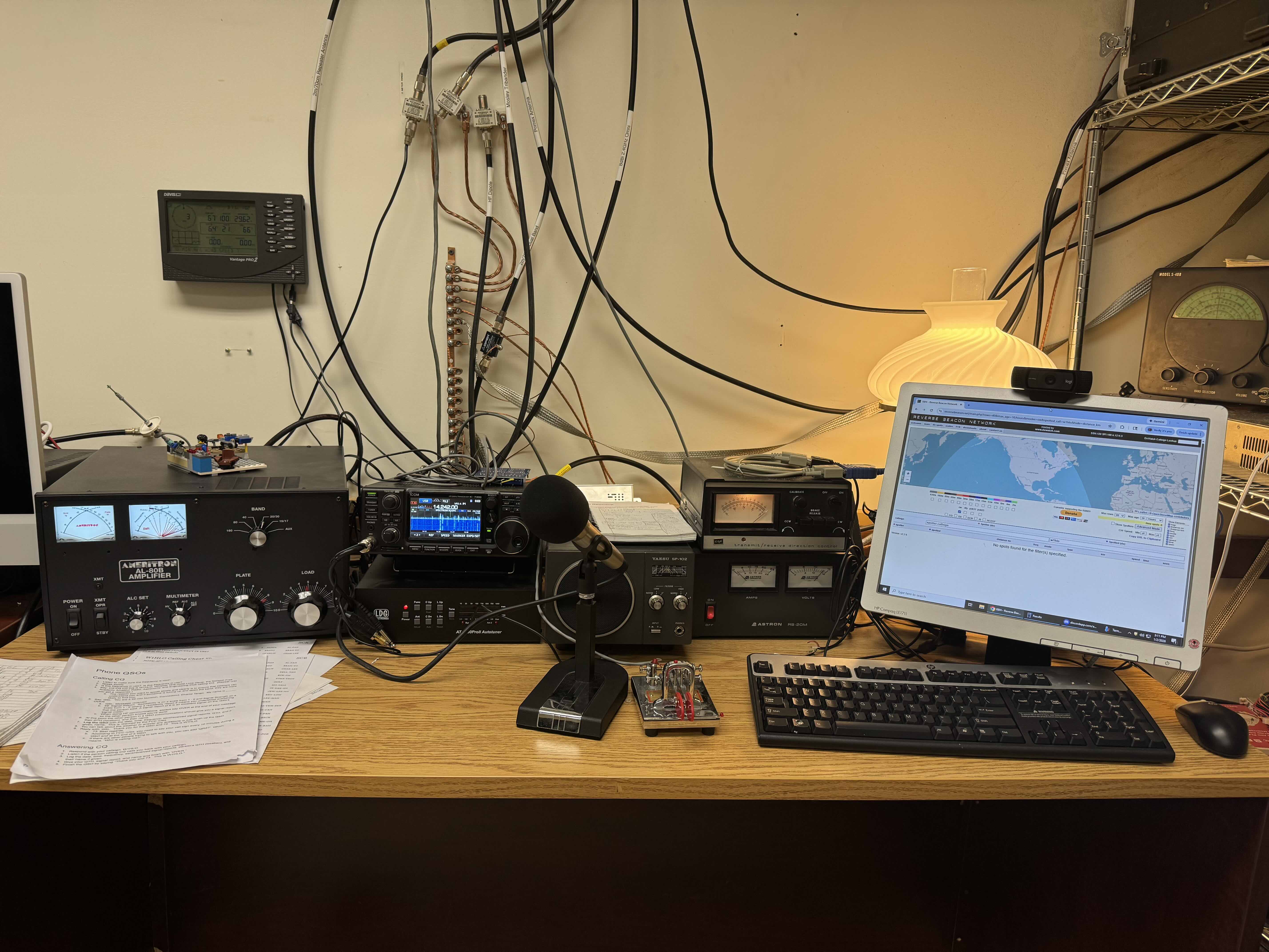 At this particular operating station, we primarily talk on 10m, 15m, and 20m using our Mosely tri-bander. We don't have a mast going through our roof that we turn by hand like W1HLO did in the old days, however, we do use a CGE rotator that was donated to us! We also operate CW from this station. Our rig is an ICOM IC-7300 connected to an Ameritron AL-80B for a little extra "oomph."